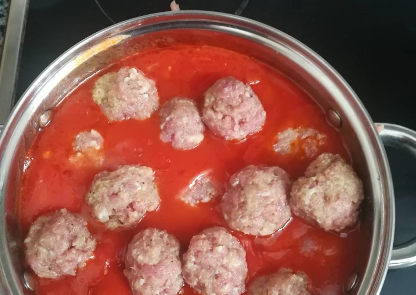 - Referir lo que queda de cebolla y dos dientes de ajo con aceite de oliva, cuando se doren, añadirle el tomate frito y cuando empiece a hervir ir introduciendo la carne hecha bolitas.