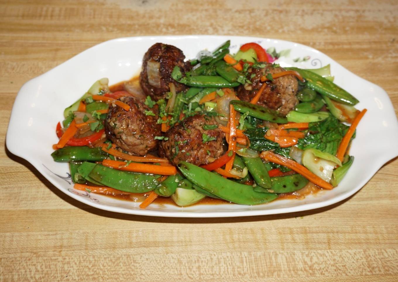 Albóndigas al estilo chino con salteado de vegetales. Esta es una manera diferente para comer albóndigas.