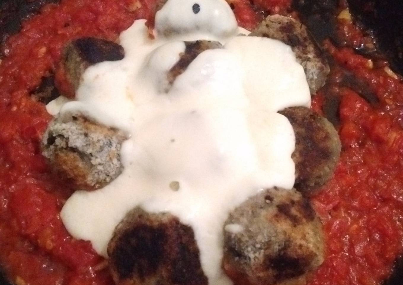 - Preparar una salsa fileto rápida con un diente de ajo y dos tomates (yo usé tomate triturado). Cocinar por unos minutos hasta que el tomate tome un color más intenso. Salpimentar y agregar las albóndigas. Cocinas por unos minutos y agregarle queso cremoso encima.