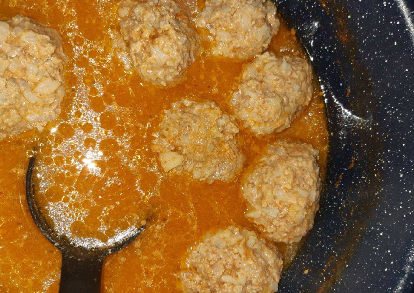 - Ponemos aceite menos de una cucharada y le ponemos el jugo de jitomate y le ponemos más agua y el consomé y la sal, revolvemos y vamos poniendo las albóndigas en el caldo