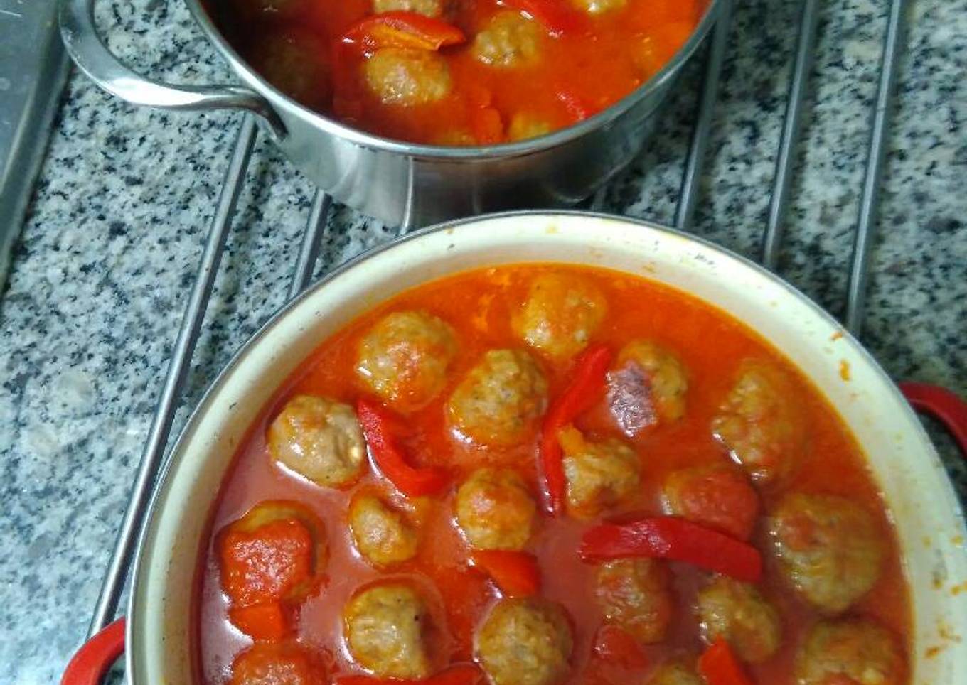 - Cuando haya acabado el tomate, las albóndigas se habrán cocinado por dentro por el calor de la misma salsa y de esta manera no quedan secas; entonces pondremos unas tiras de pimiento morrón por encima. Qué aproveche!