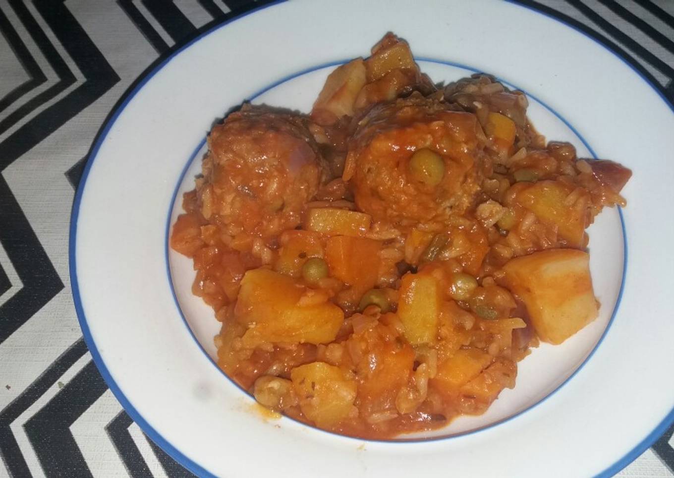 - Mientras tanto hacer un sofrito con cebolla y morrón, pasar las pelotitas para sellar y agregar la pulpa de tomate con 1 cta de azúcar, condimentar y dejar un rato 15 'más o menos, agregar agua y las verduras en pequeños trocitos.Cuando falte poco para que las verduras queden cocidas agregar arvejas y retirar albóndigas.Podemos cocinar ahí mismo 1/2 taza de arroz o si tenemos ya cocido agregarlo al final de la cocciónde la papa y boniatos.Colocamos de nuevo las albóndigas.